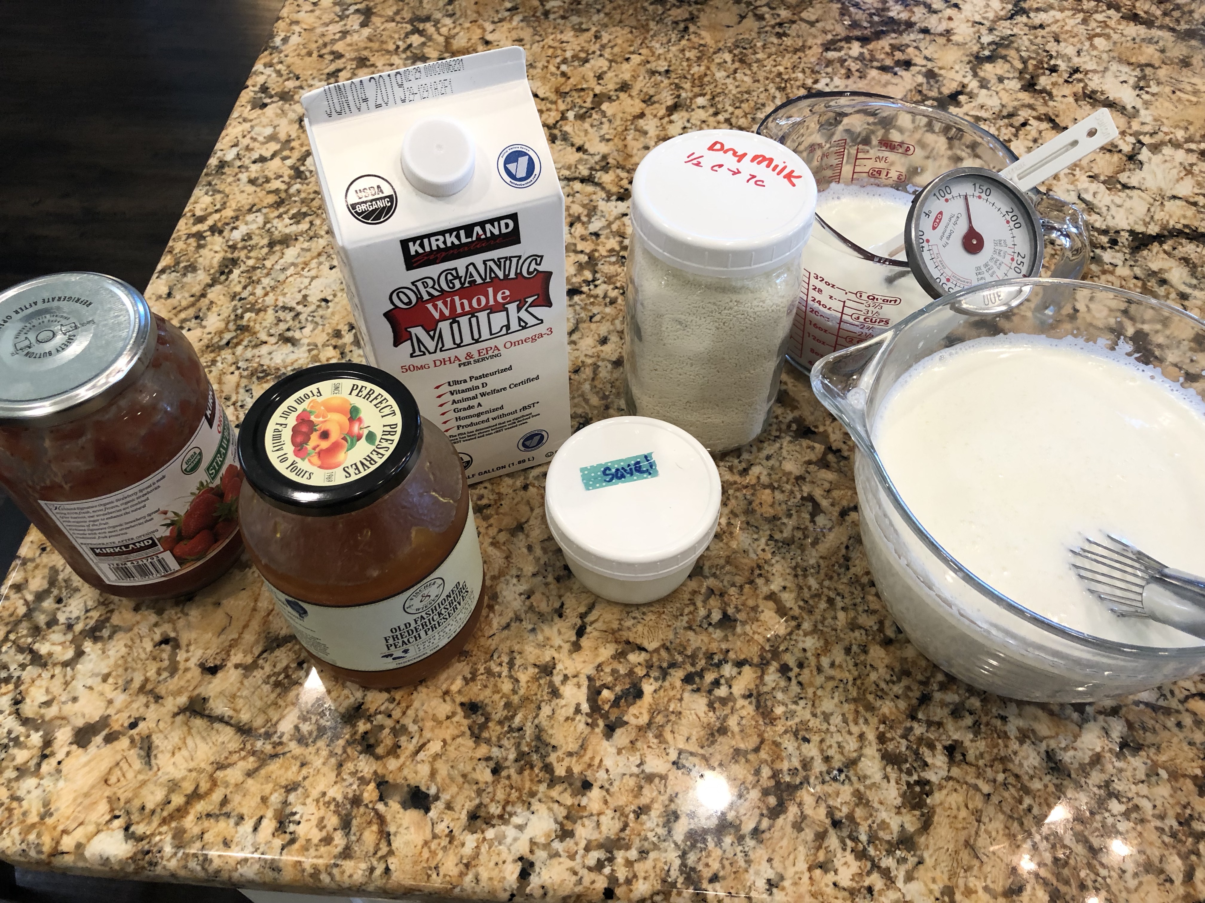- MIX milk and dry milk in a microwaveable bowl and heat to 180℉ degrees. (It takes about 10 minutes in my microwave). You can heat it on the stove if you prefer. The important thing is to heat it to this temperature killing any bacteria that is present and will compete with the yogurt bacteria. (I have also forgotten the dry milk and added it after the heating process and mine turned out fine.)