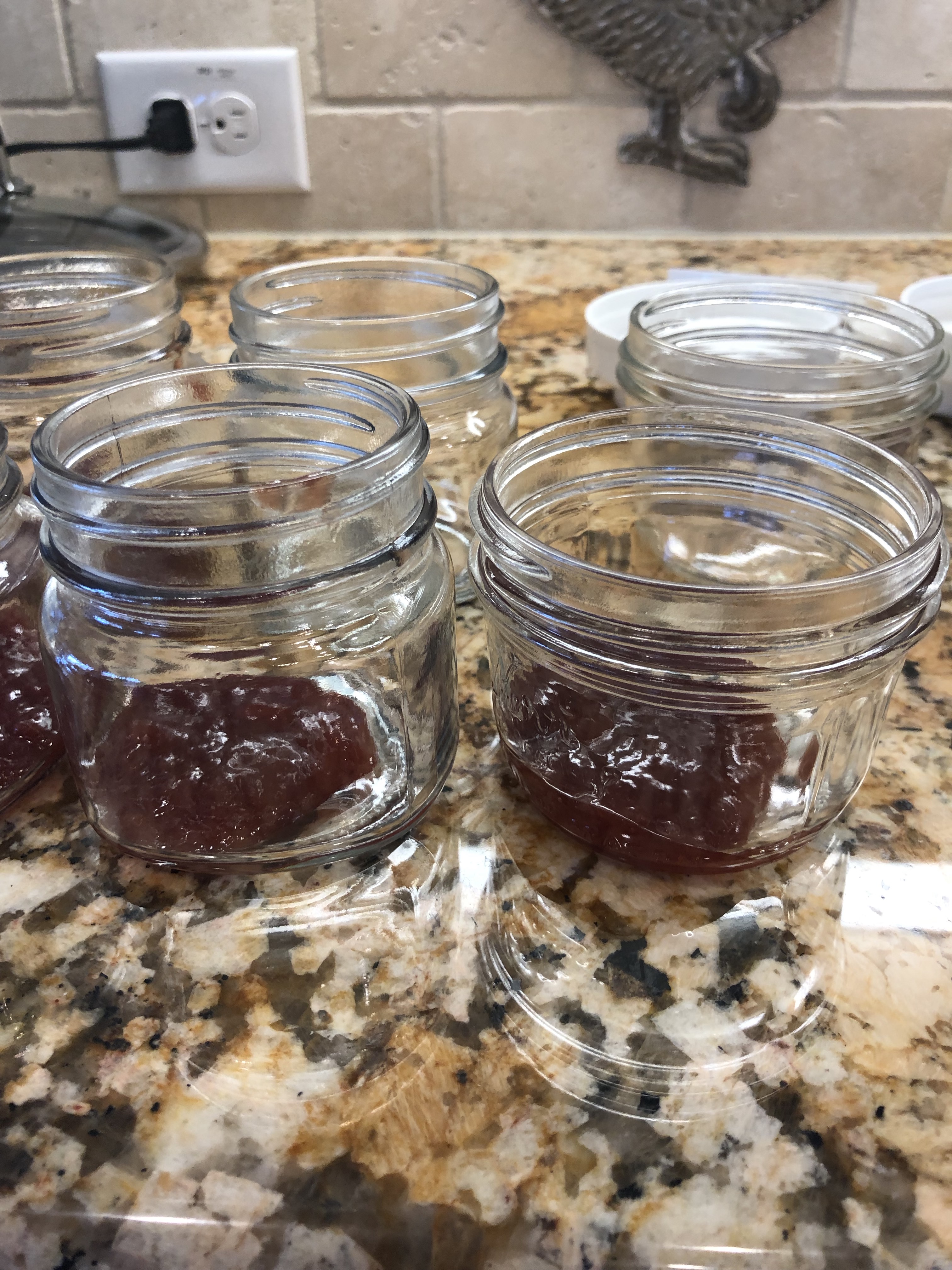 - While waiting for the mixture to cool, add 1-2 T of jam to bottoms of jars. DON’T FORGET TO LEAVE ONE JAR PLAIN FOR FUTURE STARTER.